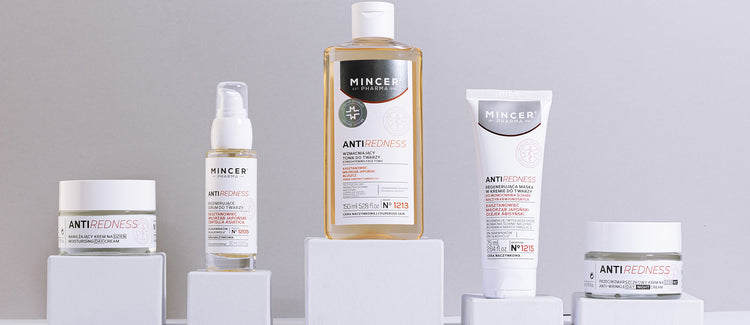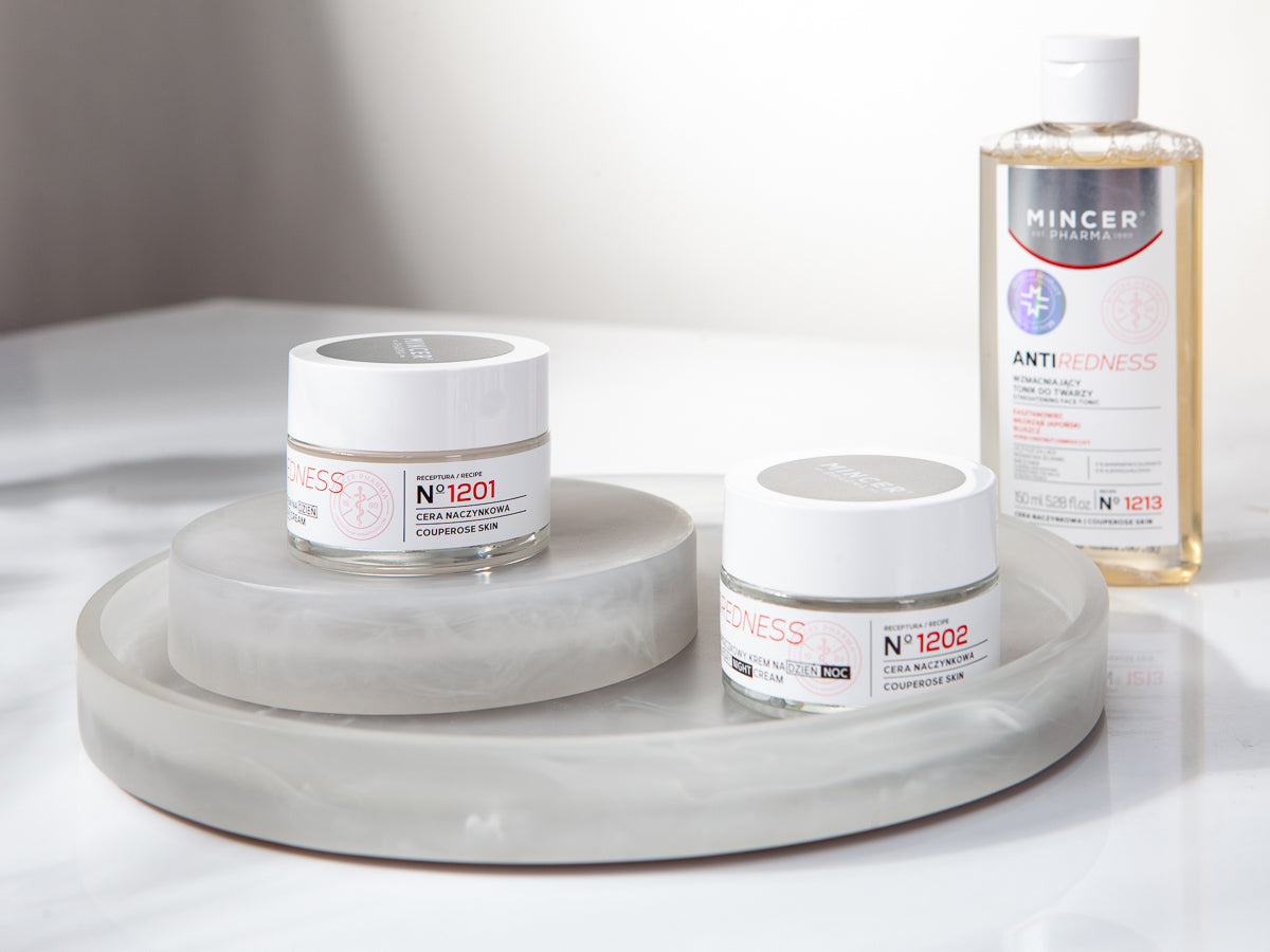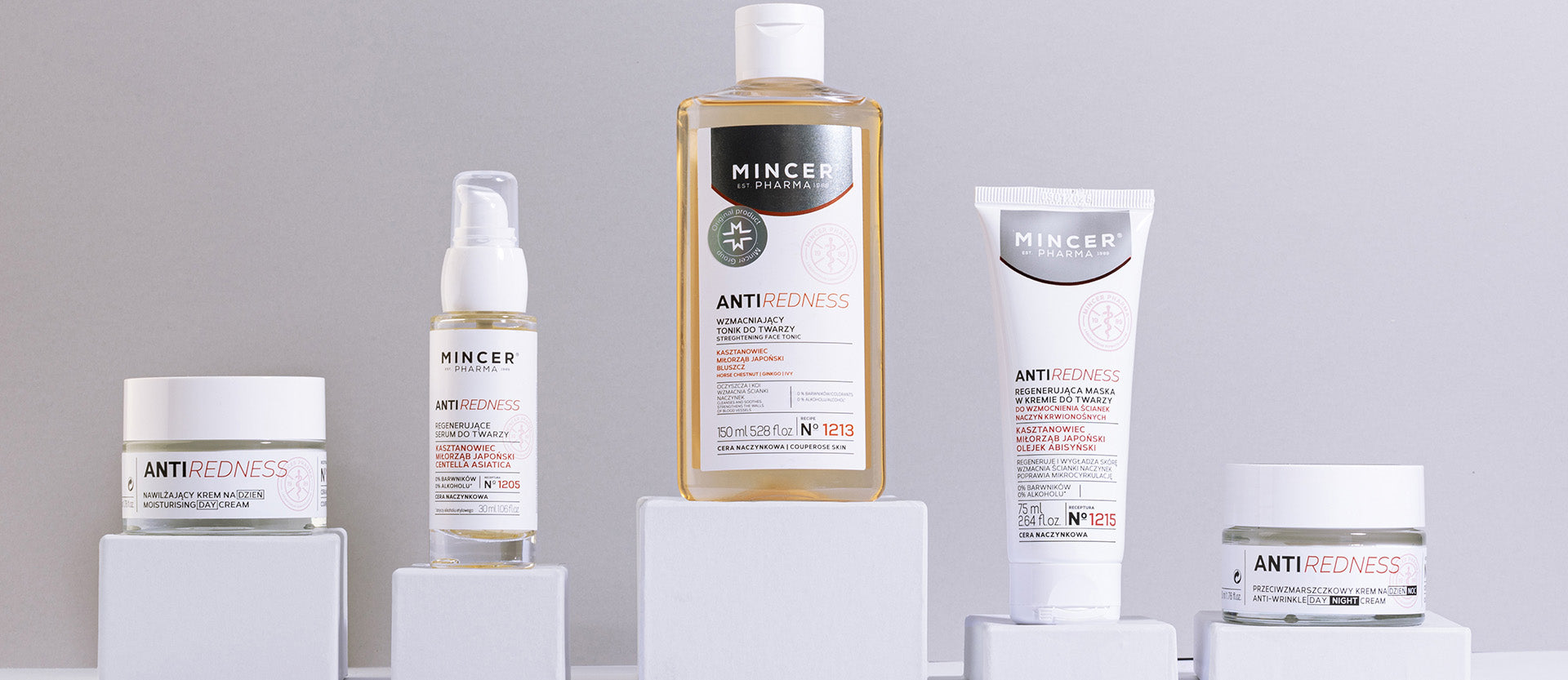 Linia Antiredness od Mincer Pharma została opracowana specjalnie dla osób z cerą naczynkową i wrażliwą. Produkty takie jak krem na cerę naczynkową i krem przeciwzmarszczkowy wzmacniają ściany naczyń krwionośnych, redukują widoczność zaczerwienień i poprawiają elastyczność skóry.