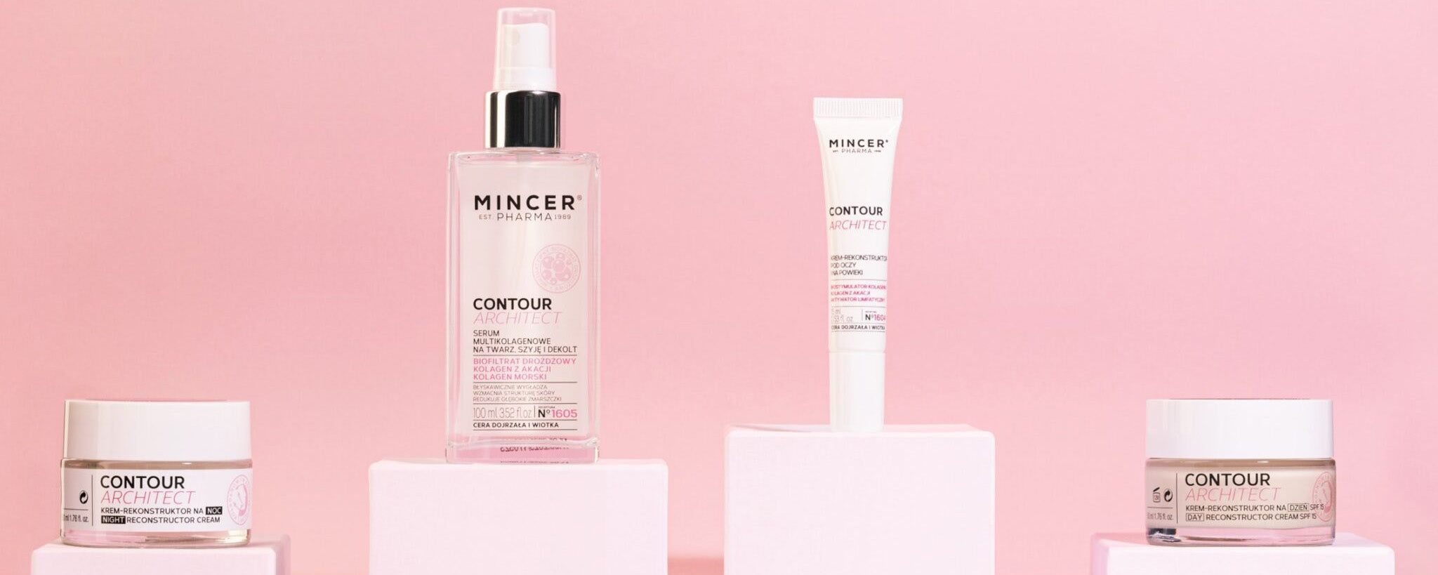 Seria Contour Architect od Mincer Pharma została stworzona z myślą o potrzebach skóry dojrzałej i wiotkiej. Jej formuła opiera się na synergii trzech rodzajów kolagenu: kolagenu z akacji, kolagenu morskiego oraz biostymulatora kolagenu. Te składniki aktywne wspierają odbudowę struktury skóry, poprawiają jej gęstość i elastyczność, a także przyczyniają się do redukcji zmarszczek.