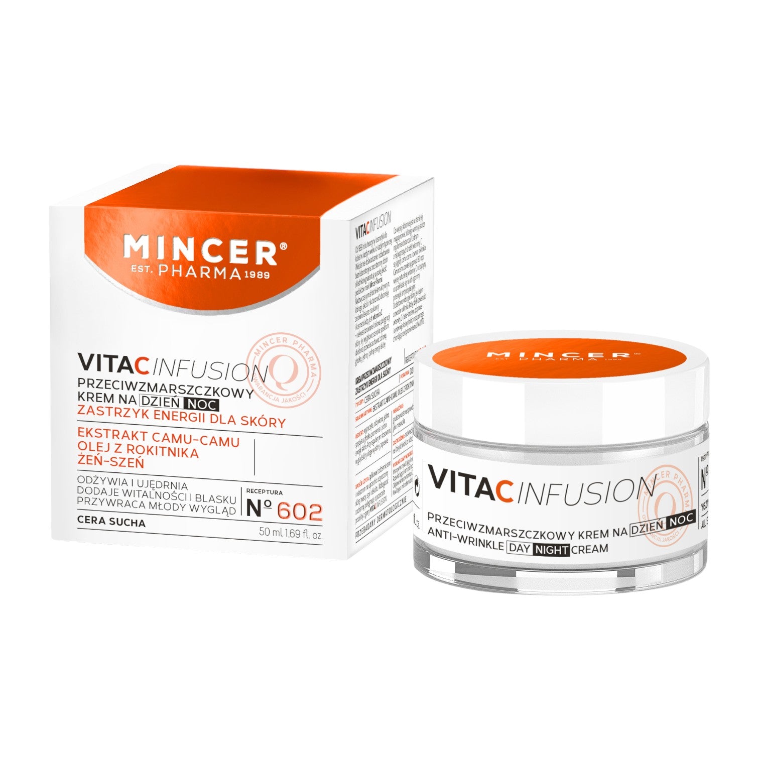 Przeciwzmarszczkowy krem na dzień i na noc z linii Vita C Infusion dający zastrzyk energii skórze. Krem redukuje zmarszczki i przebarwienia. Skóra jest wypoczęta, odżywiona, jędrna, sprężysta oraz gładka. Krem na dzień dedykowany cerze suchej. Ekstrakt camu-camu oraz olej z rokitnika to składniki aktywne zawierające potężną dawkę witaminy C. Krem zawiera również żeń-szeń, który poprawia ukrwienie skóry, dzięki czemu sprzyja to szybszej regeneracji oraz lepszemu odżywieniu skóry. Składniki aktywne sprawiają, że cera odzyskuje witalność i zdrowy koloryt. Przy regularnym stosowaniu wygląd skóry ulega wyraźnej poprawie.