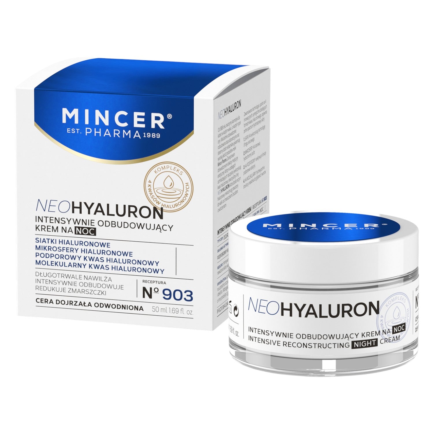Intensywnie odbudowujący krem na noc z linii NeoHyaluron regeneruje skóre, odżywia oraz ujędrnia. Widocznie odmłodzona skóra. Krem dedykowany jest cerze odwodnionej. Receptura zawiera składniki aktywne takie jak podporowy kwas hialuronowy wpływający na procesy regeneracyjne włókien podporowych, molekularny kwas hialuronowy zwiększający elastyczność skóry, siatki hialuronowe zapobiegające w tworzeniu się zmarszczek i pozwalające modelować owal twarzy oraz mikrosfery hialuronowe.